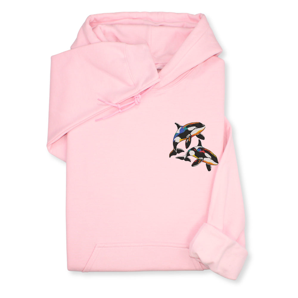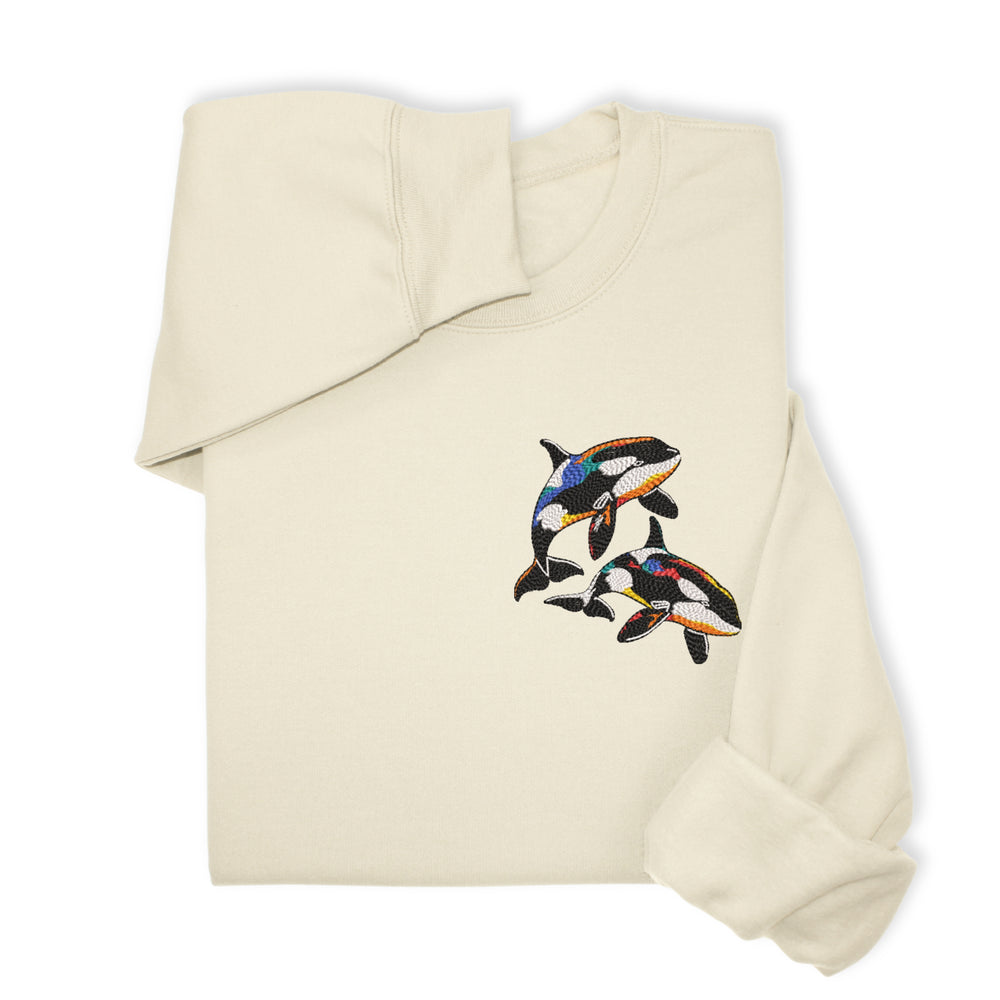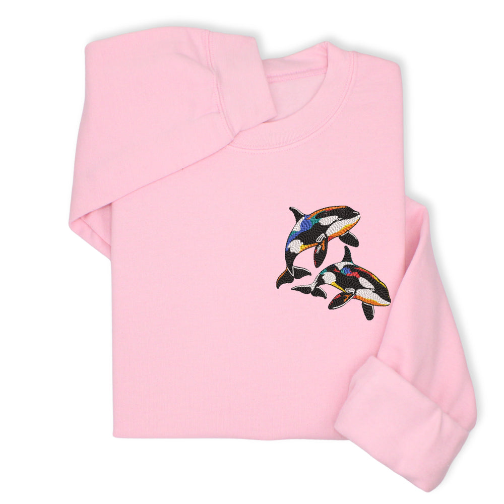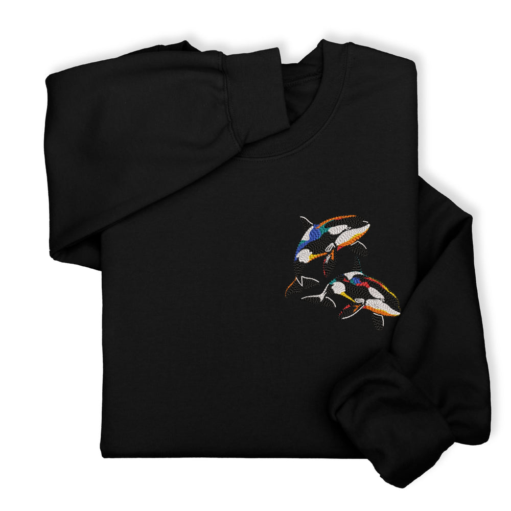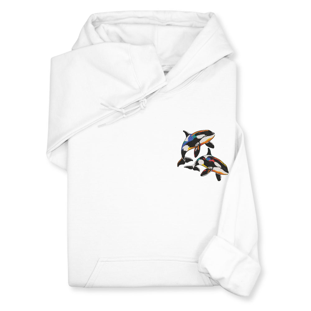 A cozy sweatshirt or hoodie with colorful orca embroidery — perfect for: