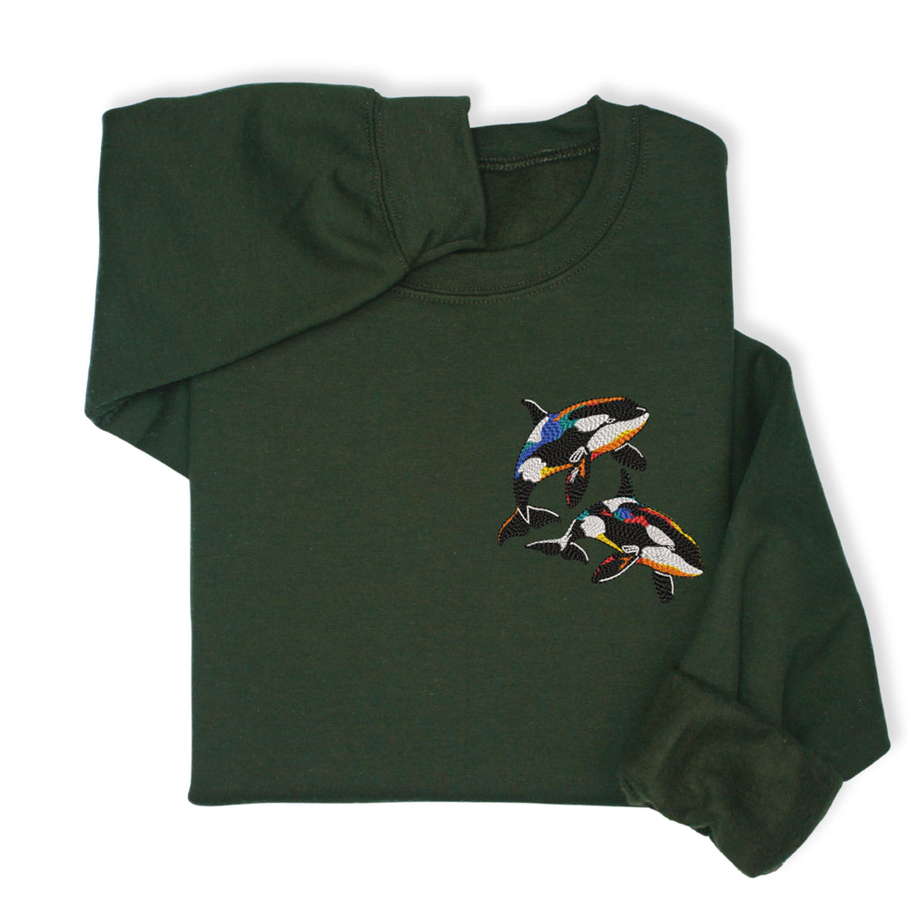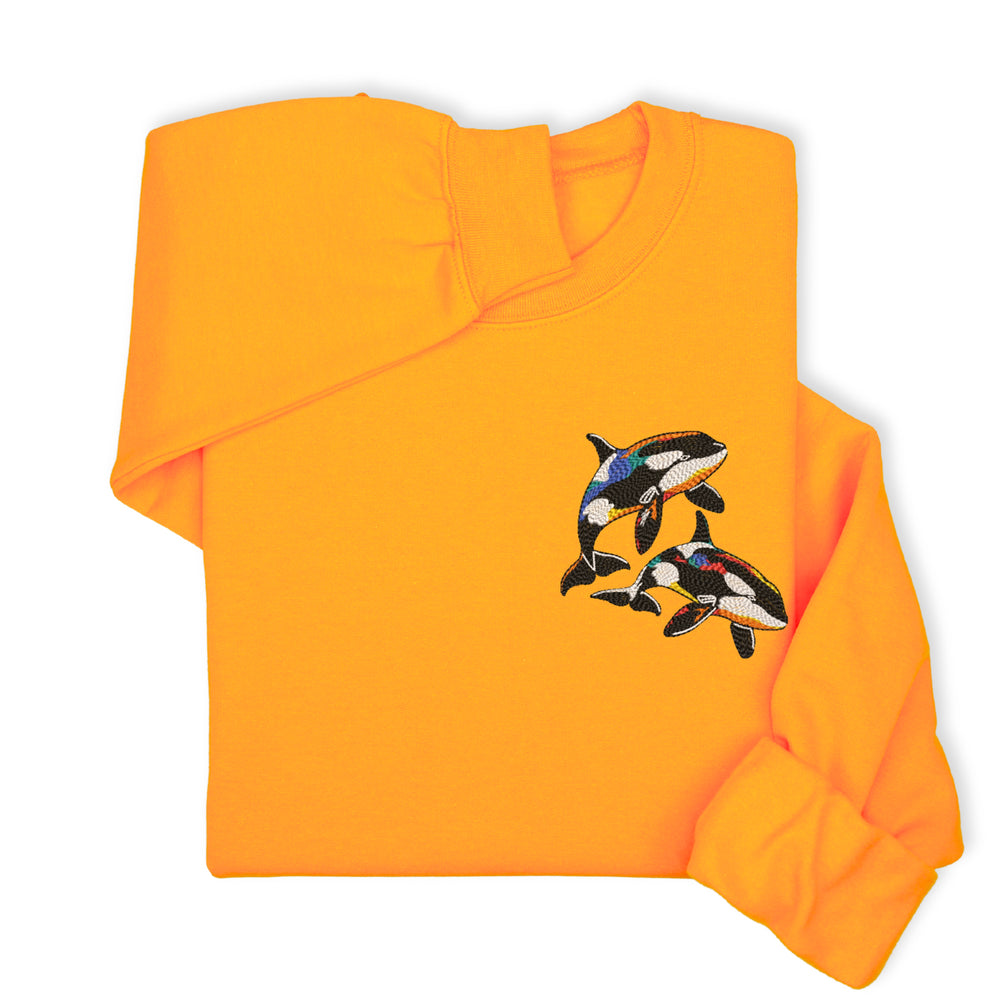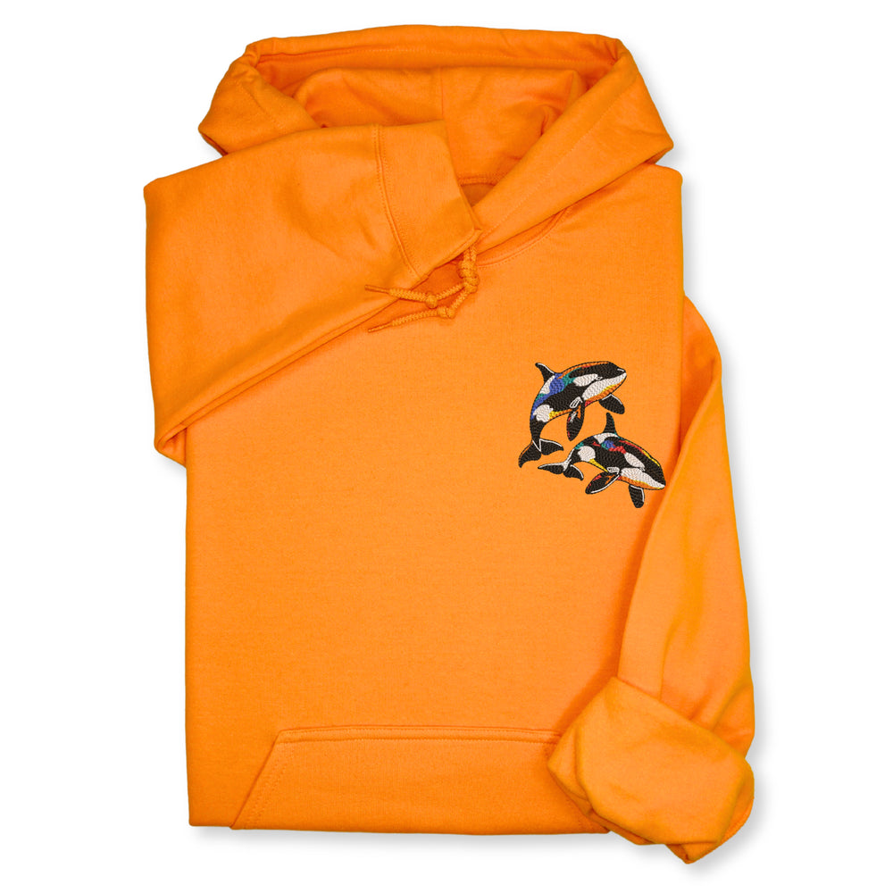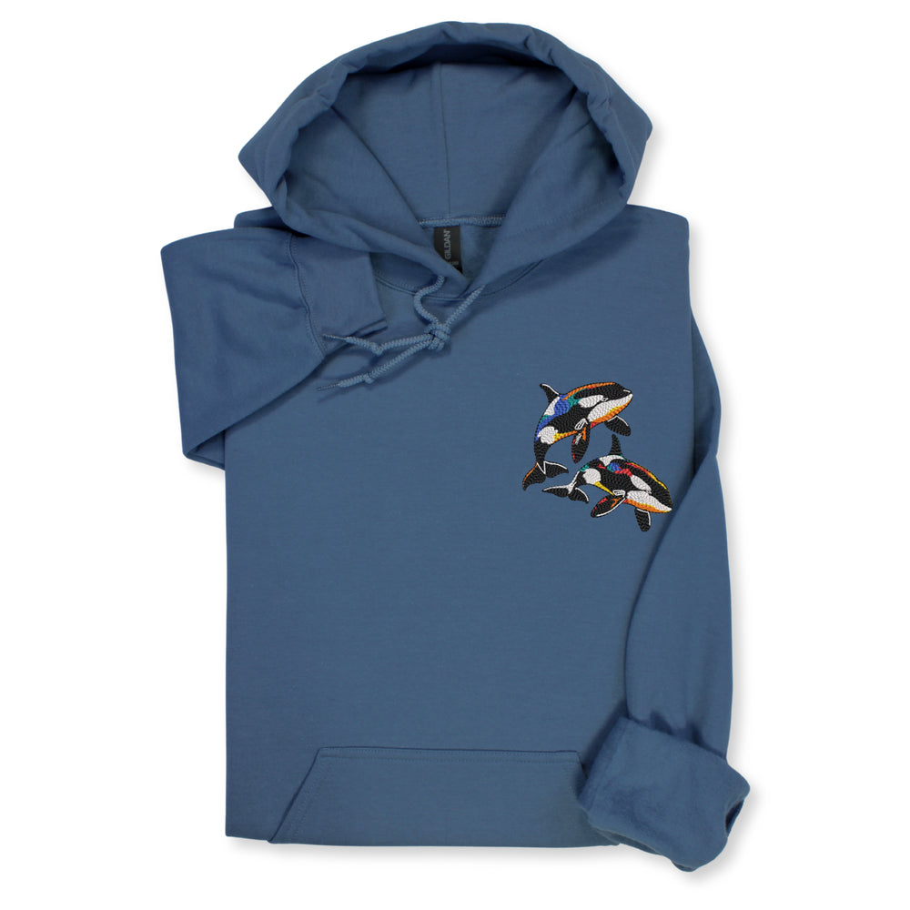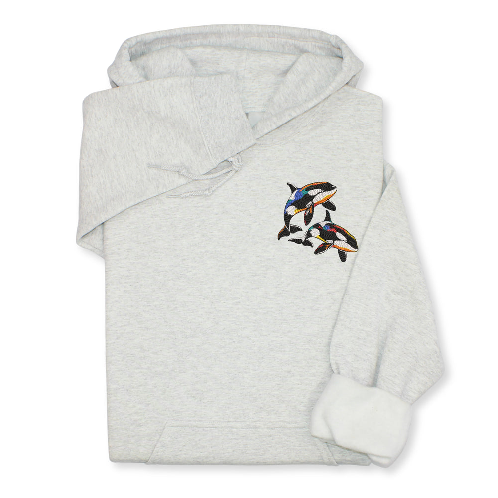 A cozy sweatshirt or hoodie with colorful orca embroidery — perfect for: