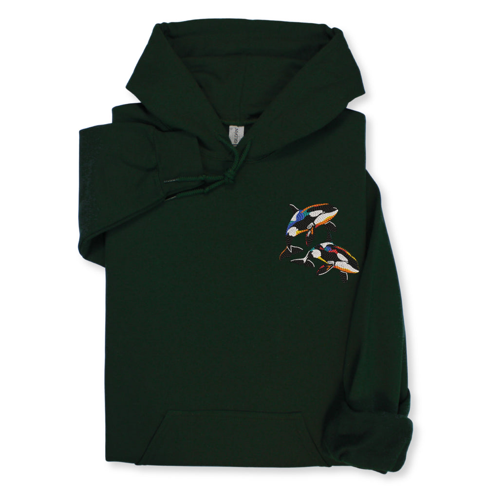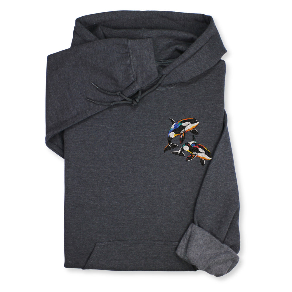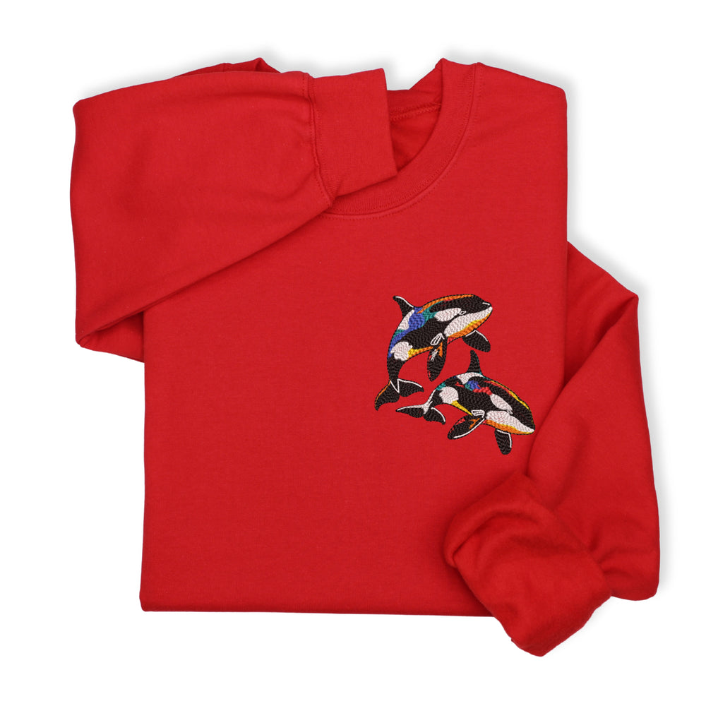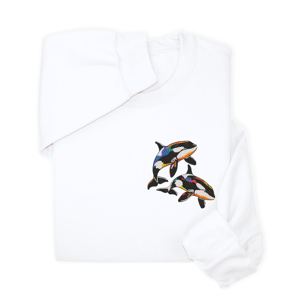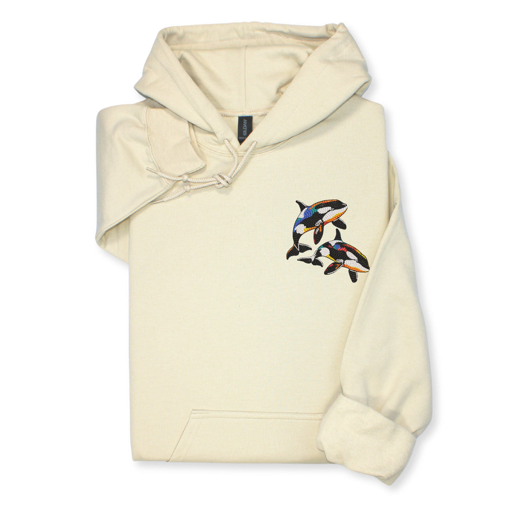 A cozy sweatshirt or hoodie with colorful orca embroidery — perfect for: