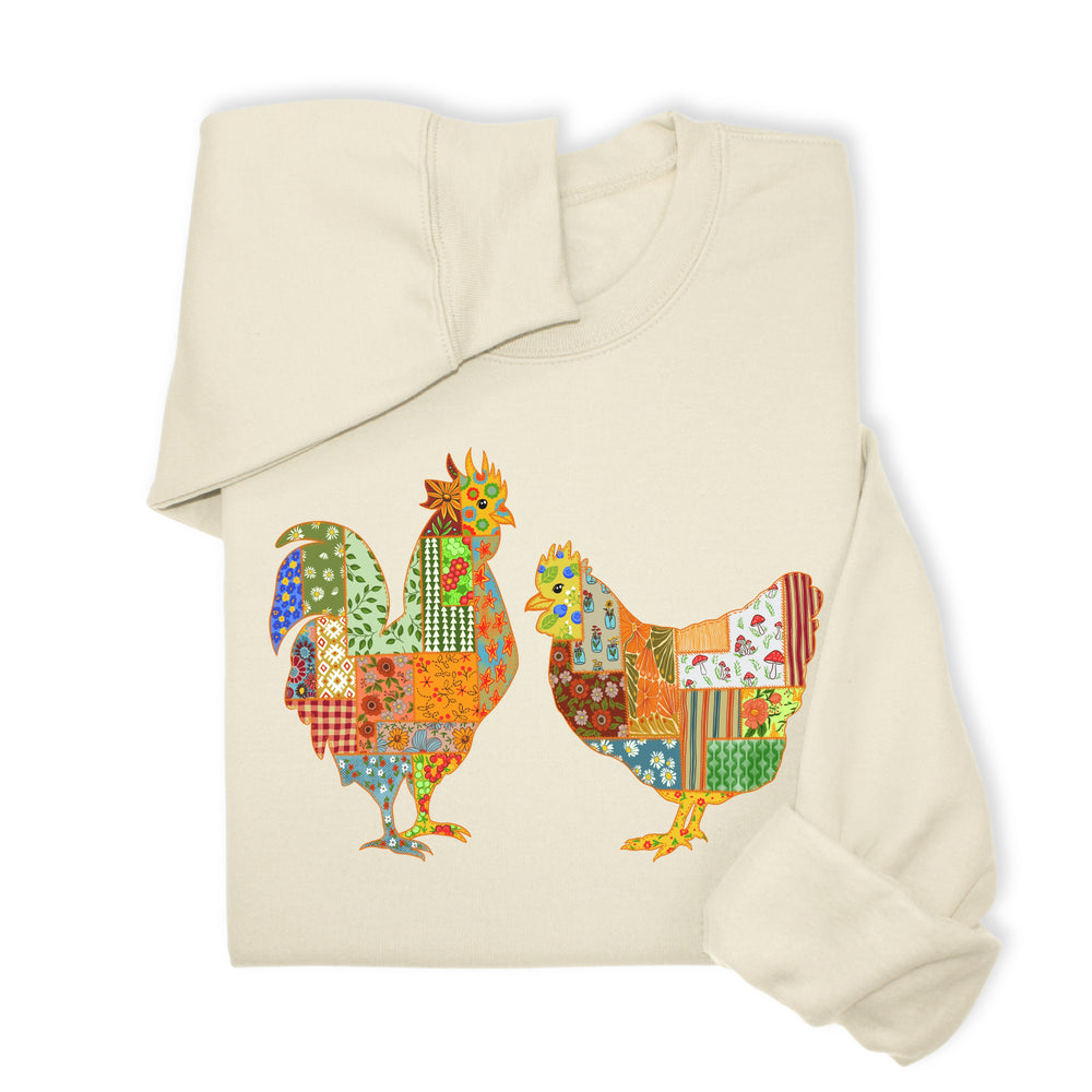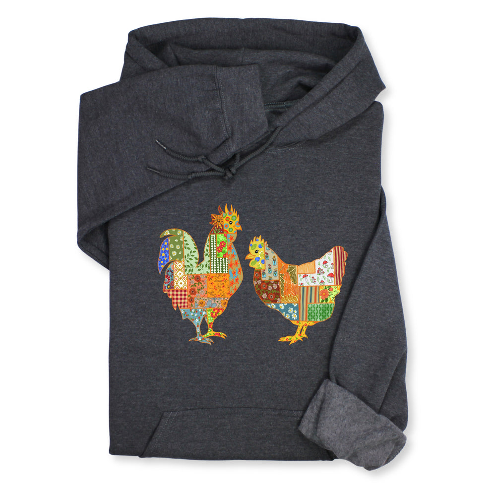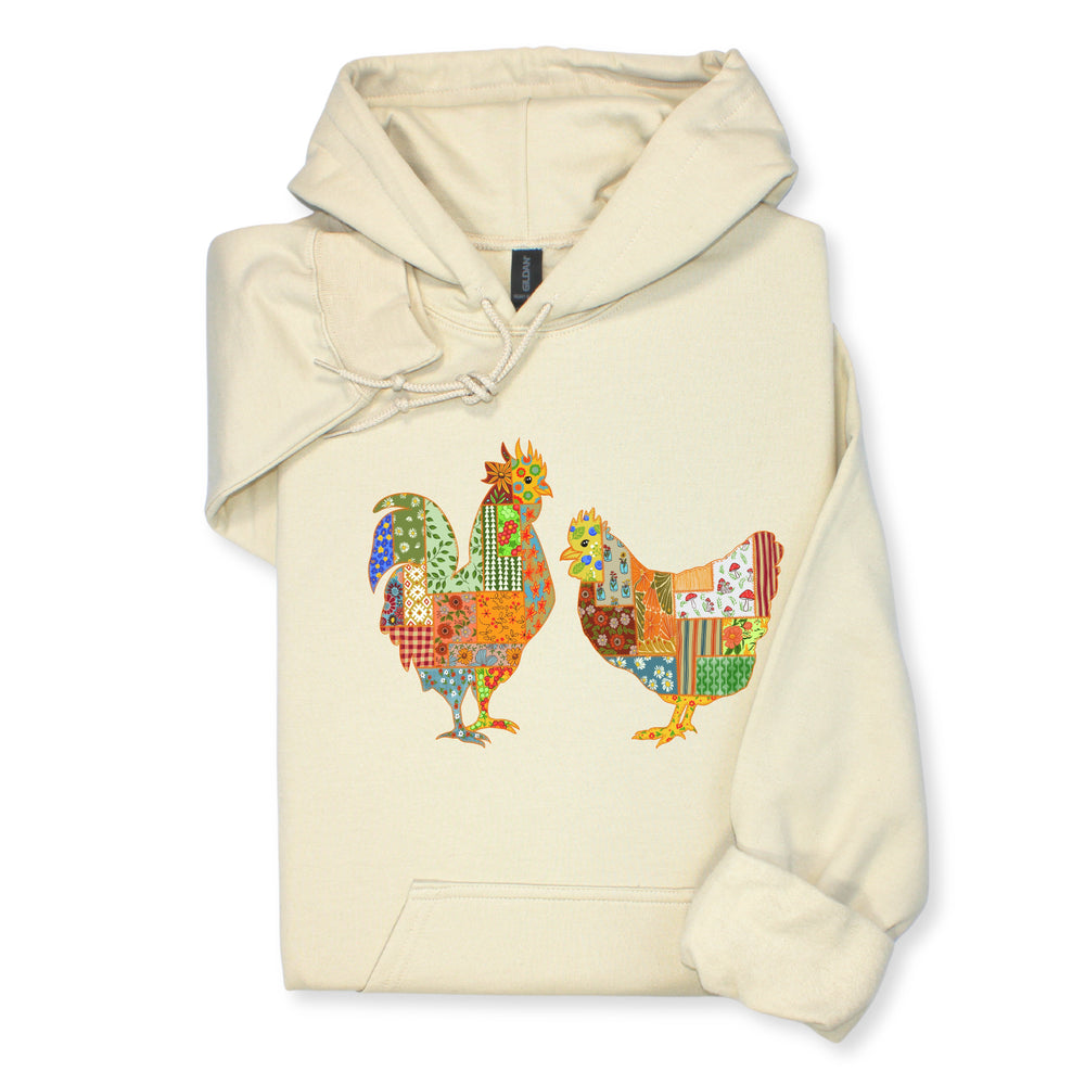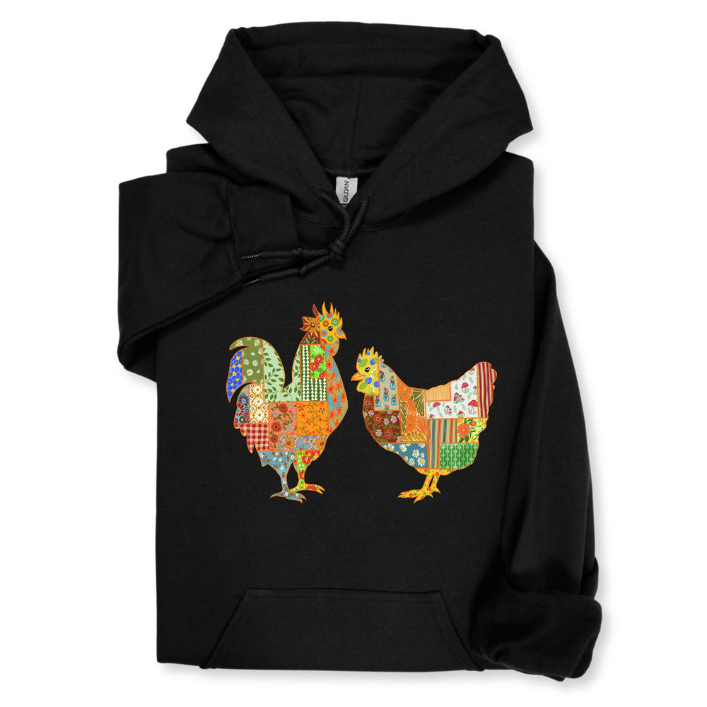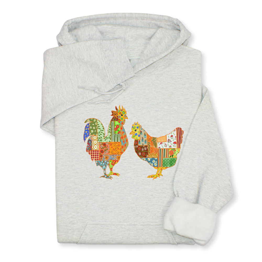Patchwork Rooster & Hen Print Hoodie & Sweatshirt, Colorful Farm Animal Gift, Whimsical Country Style Cozy Top, Rustic Folk Art Design