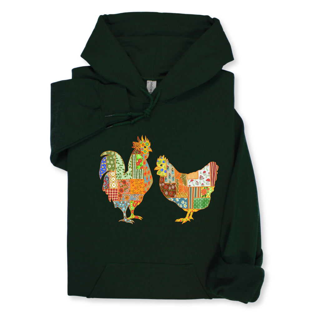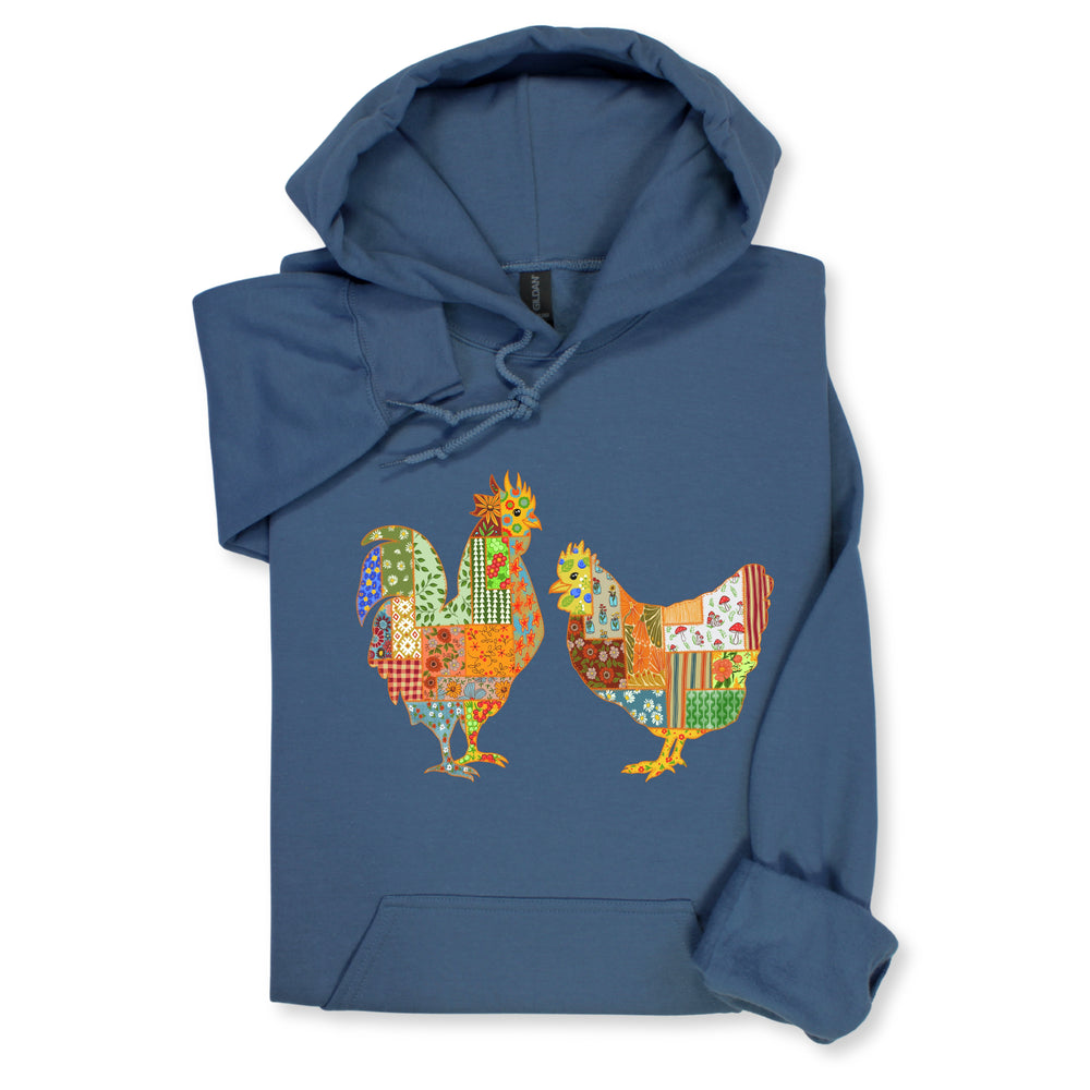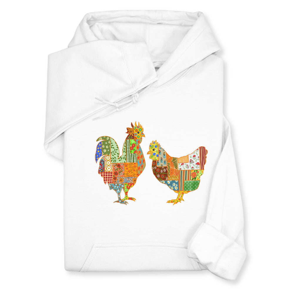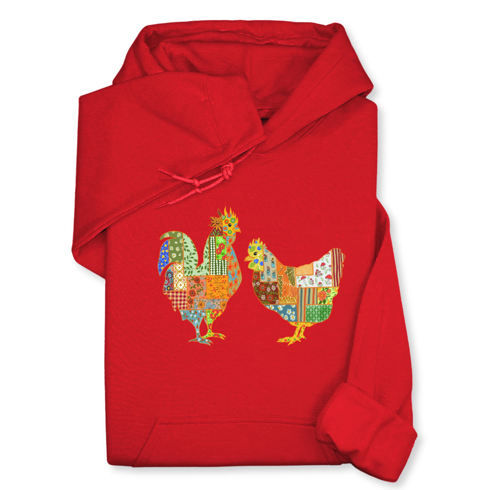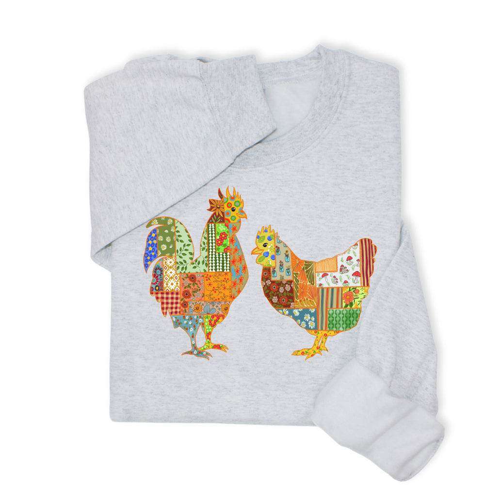 Patchwork Rooster & Hen Print Hoodie & Sweatshirt, Colorful Farm Animal Gift, Whimsical Country Style Cozy Top, Rustic Folk Art Design