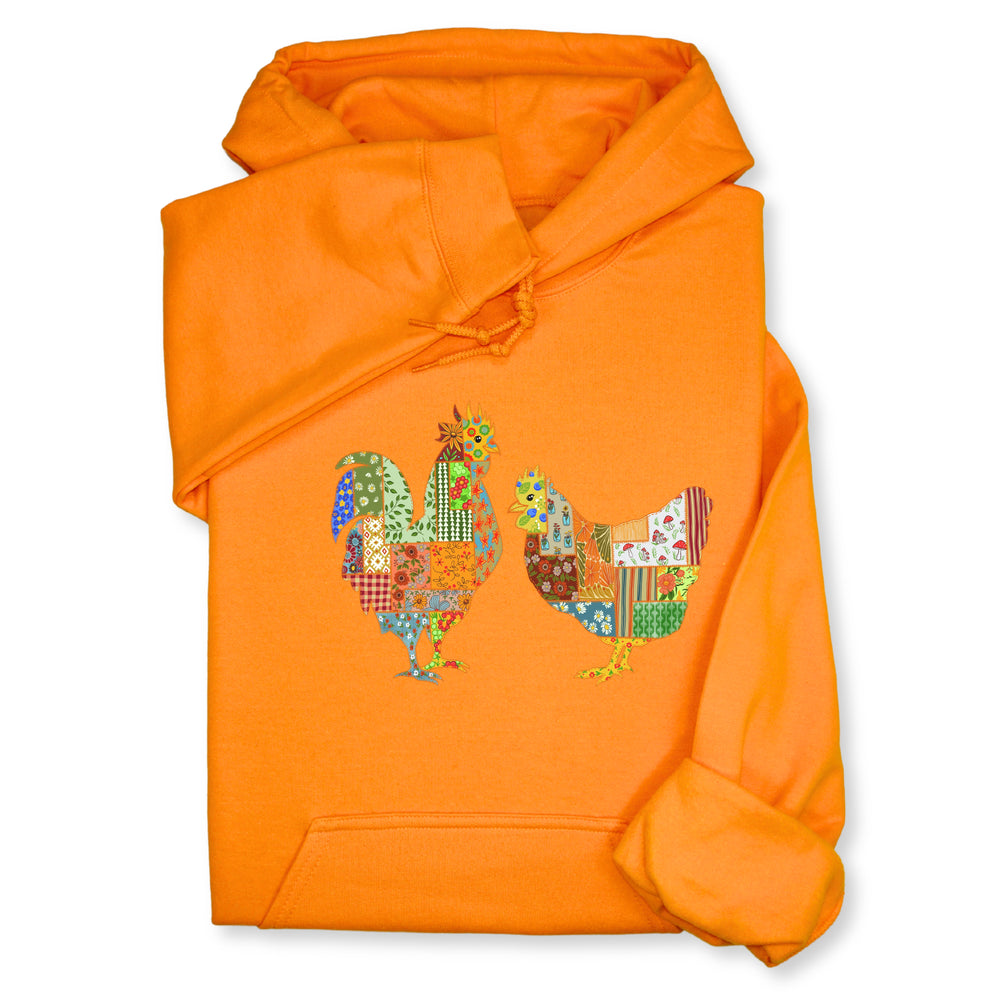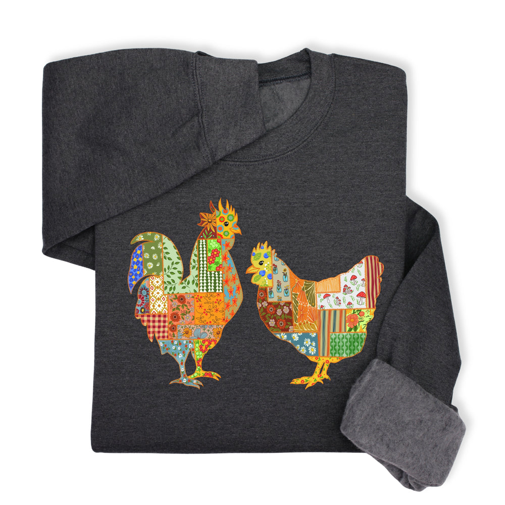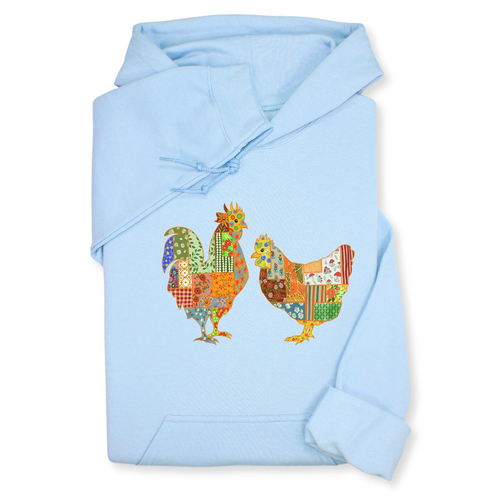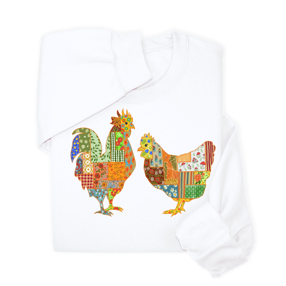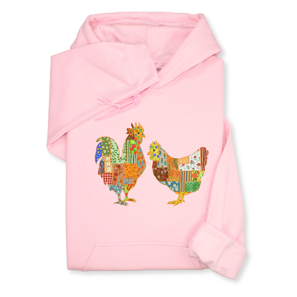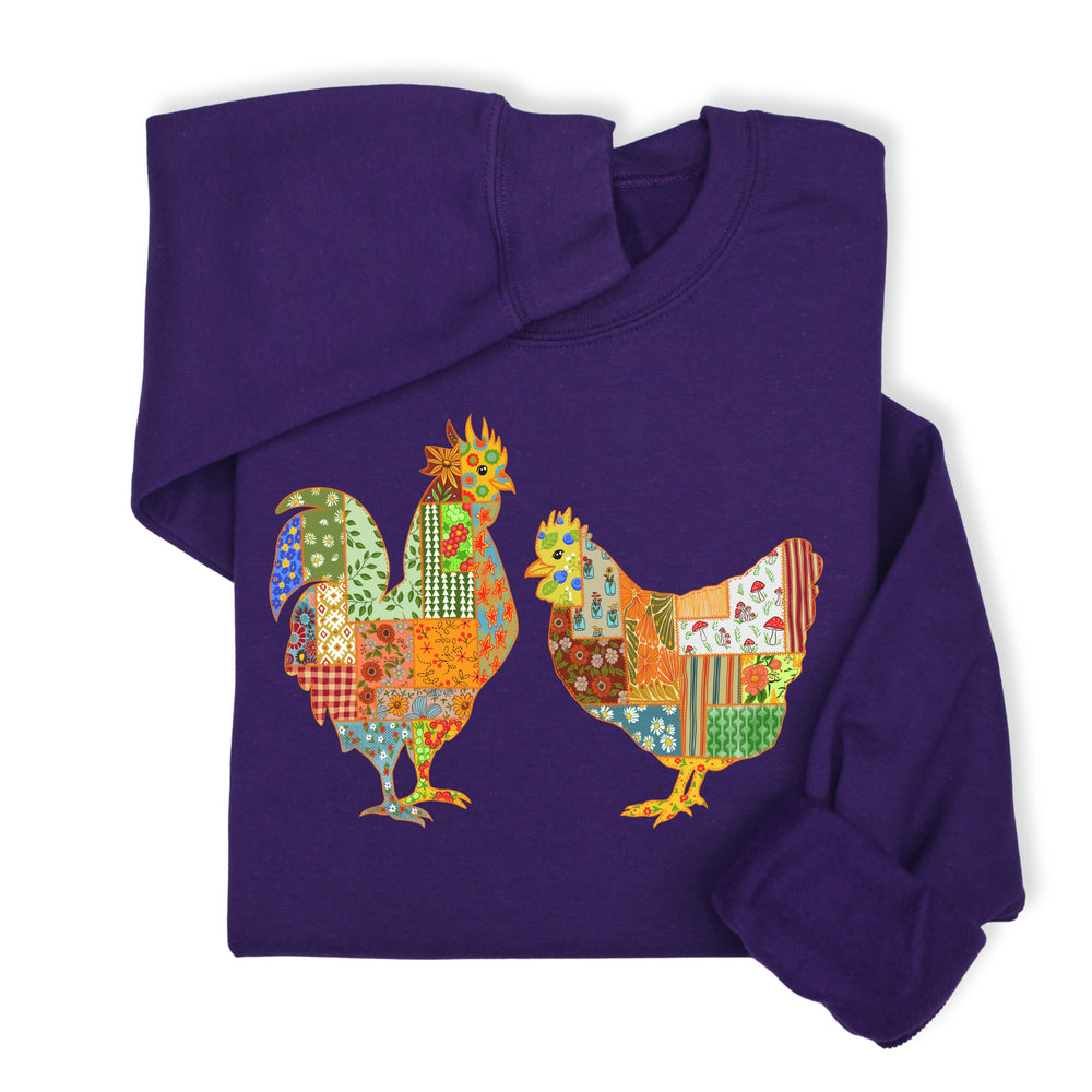 Patchwork Rooster & Hen Print Hoodie & Sweatshirt, Colorful Farm Animal Gift, Whimsical Country Style Cozy Top, Rustic Folk Art Design