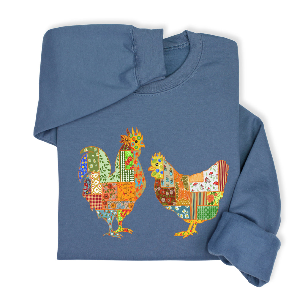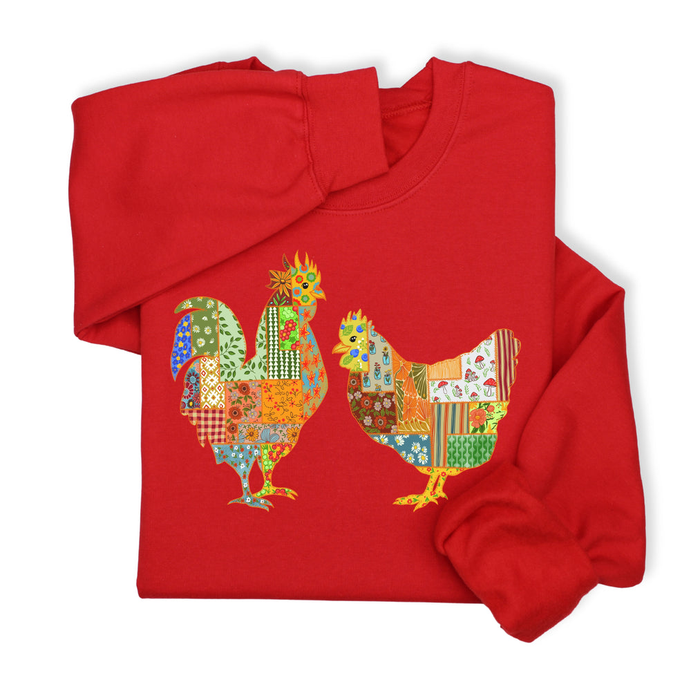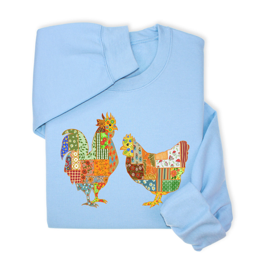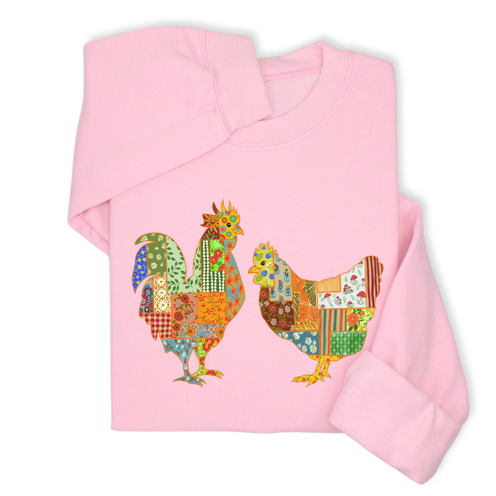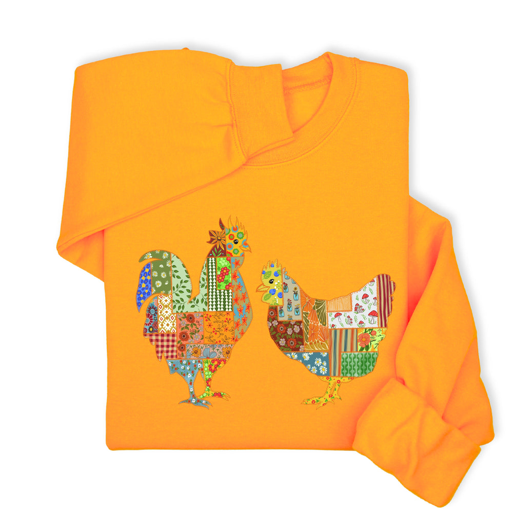 Patchwork Rooster & Hen Print Hoodie & Sweatshirt, Colorful Farm Animal Gift, Whimsical Country Style Cozy Top, Rustic Folk Art Design